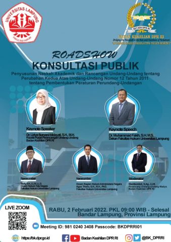 Legal Standing dan Kualifikasi Pemohon Dalam Judicial Review FH Unila is inviting you to a scheduled Zoom meeting. Topic: Kuliah Umum “Legal Standing Dan Kualifikasi Pemohon Dalam Judical Review “Time: Feb 5, 2022 07:30 Jakarta Join Zoom Meetinghttps://us02web.zoom.us/j/3823846025?pwd=bzNtOFZaam12SzB3Y0o1dTA5NWJXQT09 Meeting ID: 382 384 6025Passcode: fhunila