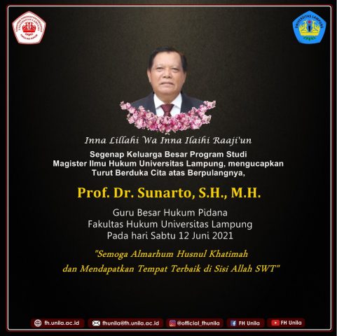 Segenap Keluarga Besar Program Studi Magister Ilmu Hukum Universitas Lampung, mengucapkan Turut Berduka Cita atas Berpulangnya, “Prof. Dr. Sunarto, S.H., M.H.” Guru Besar Hukum Pidana Fakultas Hukum Universitas Lampung Pada Hari Sabtu 12 Juni 2021 “Semoga Almarhum Husnul Khatimah dan Mendapatkan Tempat Terbaik di Sisi Allah SWT”